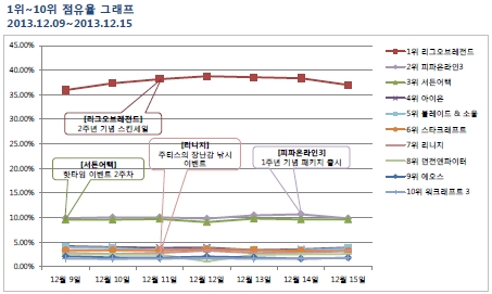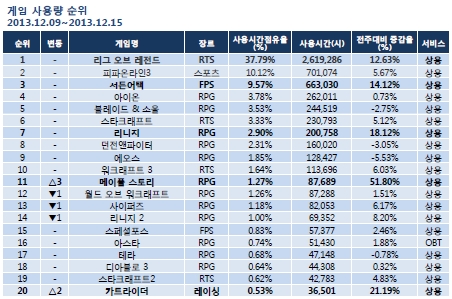 2013년 12월 2일 ~ 12월 8일의 주간 종합 게임 동향을 살펴보면, 겨울방학 시즌을 맞아 다양한 프로모션들이 진행되며 게임들의 사용량이 전반적으로 증가하는 모습을 보였다. 한국 서비스 2주년을 맞은 ‘리그 오브 레전드’는 ‘특별 스킨 세일 이벤트’를 진행하였고, 전 주 대비 사용량은 12.63% 증가하였다. ‘잭팟 이벤트’를 본격적으로 진행중인 ‘서든어택’은 12월 19일 진행될 ‘꿀잼 업데이트’를 공개하였고, 전 주 대비 사용량이 14.12% 증가하였다. 15주년 기념 ‘주티스의 장난감 낚시’ 이벤트와, ‘혹한기 마법인형 질주 레이스!’ 이벤트를 진행한 ‘리니지’는 전 주 대비 사용량이 18.12% 증가하였다. 네이버 채널링 이후 꾸준한 상승세를 보이는 ‘메이플스토리’는 12월 12일 부터 ‘Play 메이플스토리 체험전 오픈 기념 이벤트’와 ‘경험치 2배’ 이벤트를 진행하며 전 주 대비 사용량이 51.8% 크게 증가하였고, 순위는 3계단 상승하여 11위에 위치하였다. ‘리니지 2’는 신규 종족 ‘아르테이아’를 업데이트 하였고, 관련하여 ‘도전! 미션의 제왕’등 다양한 이벤트를 진행하며 사용량이 전 주 대비 8.2% 증가하였으나 ‘메이플스토리’의 순위상승으로 인해 순위가 1계단 하락하였다. ‘월드 오브 워크래프트’, ‘사이퍼즈’도 마찬가지로 사용량은 증가하였으나 순위는 1계단씩 하락하였다. ‘형돈이와 대준이’를 홍보 모델로 앞세우며 ‘2014 사상 최대! 최강! 이벤트’를 진행중인 ‘카트라이더’는 전 주 대비 사용량이 21.19% 증가하였고, 순위는 2계단 상승하여 20위권 내로 진입하였다.
