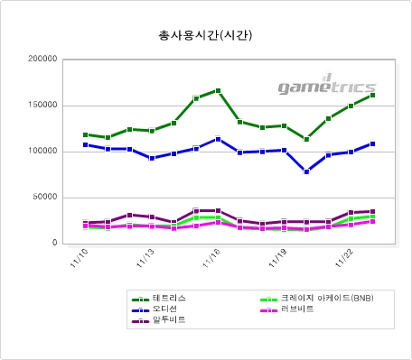 아케이드 ? 국민 게임 ‘테트리스’가 급상승 아케이드 장르의 PC방 순위는 테트리스 ? 오디션 ? 알투비트 - 크레이지 아케이드 - 러브비트 순으로 나타난다. 11월 17일(월)~11월 23일(일) 기시간 등락율을 살펴보면 전주 대비 테트리스(+1.17%) 상승한 반면, 크레이지아케이드(-9.55%), 알투비트(-7.56%), 오디션(-5.27%), 러브비트(-3.56%)는 하락하였다. 2006년도에 사라졌다가 다시 돌아온 국민게임 ‘테트리스’가 급상승, 2주 만에 아케이드 장르의 최고 자리를 차지했다. 아케이드 장르 내 왕좌의 자리를 지키고 있던 리듬액션게임 ‘오디션’은 벅스 오디션의 채널링 서비스 종료와 러브비트, 데뷰, 클럽데이 온라인 등 신규리듬액션 게임들의 도전으로 인해 완만한 하향세를 타고 있는 것으로 보인다.  <아케이드 장르의 사용시간>