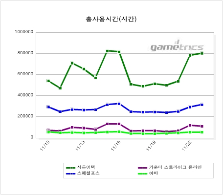 FPS장르 FPS장르의 PC방 순위는 서든어택 ? 스페셜포스 ? 카운터스트라이크 온라인- 아바 순으로 11월 둘째주와 변동사항이 없다. 11월 17일(월) ~ 11월 23일(일) 기간의 평균사용시간 등락율을 살펴보면 전주 대비 카운터스트라이크 온라인(-17.72%), 아바(-13.00%), 서든어택(-10.05%), 스페셜포스(-7.47%) 순으로 하락율을 기록하였다.