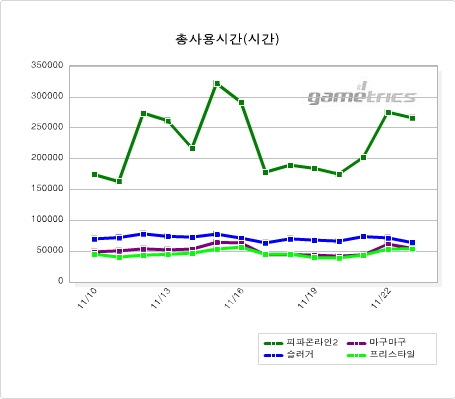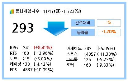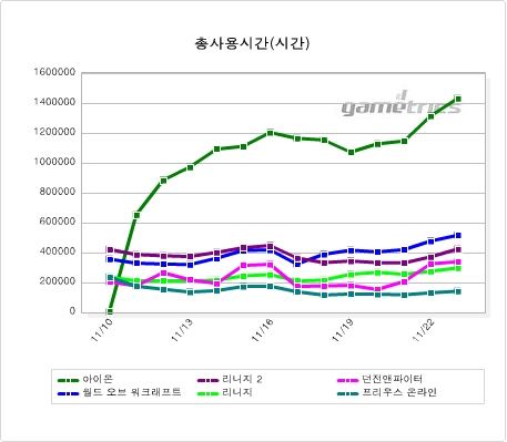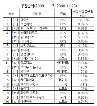 종합게임지수 - RPG장르 상승 게임전문리서치 사이트 게임트릭스(www.gametrics.com)가 11월 17일~11월 23일까지 게임사용량을 측정한 결과, 전주대비 1.7%가량 감소한 것으로 집계되었으나, 전주에 수능일이 있었음을 감안할 때 게임사용량은 어느 정도 유지한 것으로 보인다. 한편, 지난 23일(일)에는 종합게임지수가 363을 기록. 주말 평균치인 324를 훨씬 상회하였으며, 이는 설날?)과 추석?) 다음으로 최고의 종합게임지수로 기록되었다. 장르별로는 RPG가 +8.41% 상승한 반면, RTS -12.96%, 보드 -3.09%, 레이싱 -4.42%, %, FPS -10.09%, 아케이드 -5.05%, 스포츠 -11.30%, 고스톱 -5.22%, 포커 -9.33%가 감소했다.  종합순위 - RPG장르의 순위 상승 ‘굴러온 돌이 박힌 돌 뺀다’는 속담처럼 104주간 1위 자리를 굳건히 지키고 있던 FPS의 황제인 ‘서든어택’의 자리를 ‘아이온’이 서비스 첫날에 빼앗아 현재 1위를 지키고 있다. ‘월드 오브 워크래프트’는 리치왕의 분노 확장팩 출시로 ‘스타크래프트’와 ‘리니지2’를 따라잡으며 전주대비 3단계 상승, 3위에 랭크되었으며, 이벤트를 실시한 ‘리니지’도 2단계 상승하여 8위를 차지하는 등 TOP 10 내 RPG장르의 순위상승이 이루어졌다.