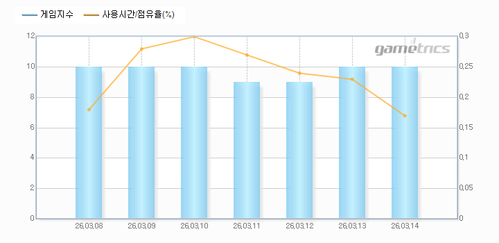 | 스포츠 장르지수는 게임트릭스에 등록된 스포츠의 게임사용시간 및 점유율의 추이를 기간별로 검색할 수 있는 서비스입니다. |
