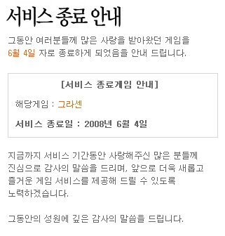 그라센이 2008년 6월 4일 서비스가 종료됨에 따라 해당 게임의 데이터 집계를 중단합니다.