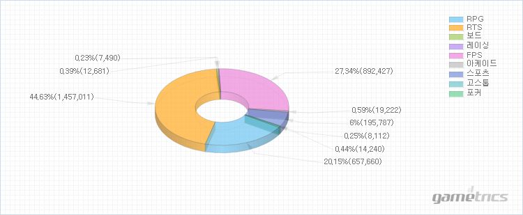 장르별 지수는 게임트릭스에 등록된 게임들을 RPG / RTS / 보드 / 레이싱 / FPS / 아케이드 / 스포츠 / 고스톱 / 포커 장르로